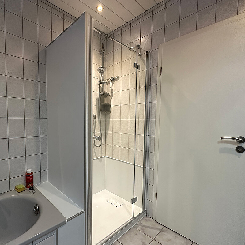 Ein kleines Bad in einem Einfamilienhaus. Die Eigentümer wohnen dort seit vielen Jahren. Die vorhandene Duschtasse hatte einen sehr tiefen Einstieg. Die vorhandene Falttür konnte nur nach innen geöffnet werden. Aufgrund einer gesundheitlichen Einschränkung, konnte die Dusche von einem Familienmitglied nur noch unter großen Schmerzen betreten werden. Zudem war es nicht möglich die Dusche mit einem Duschstuhl zu nutzen, weil die Falttür der Duschabtrennung nach innen geöffnet hat.