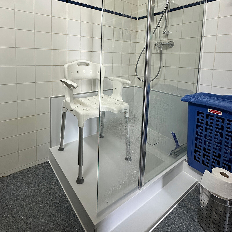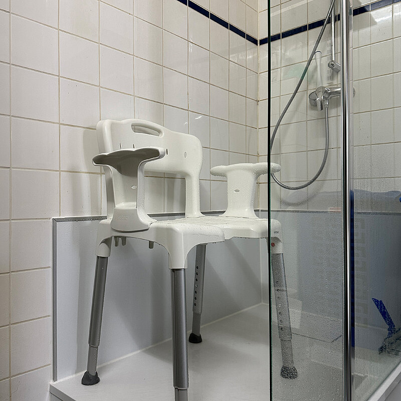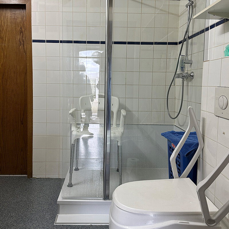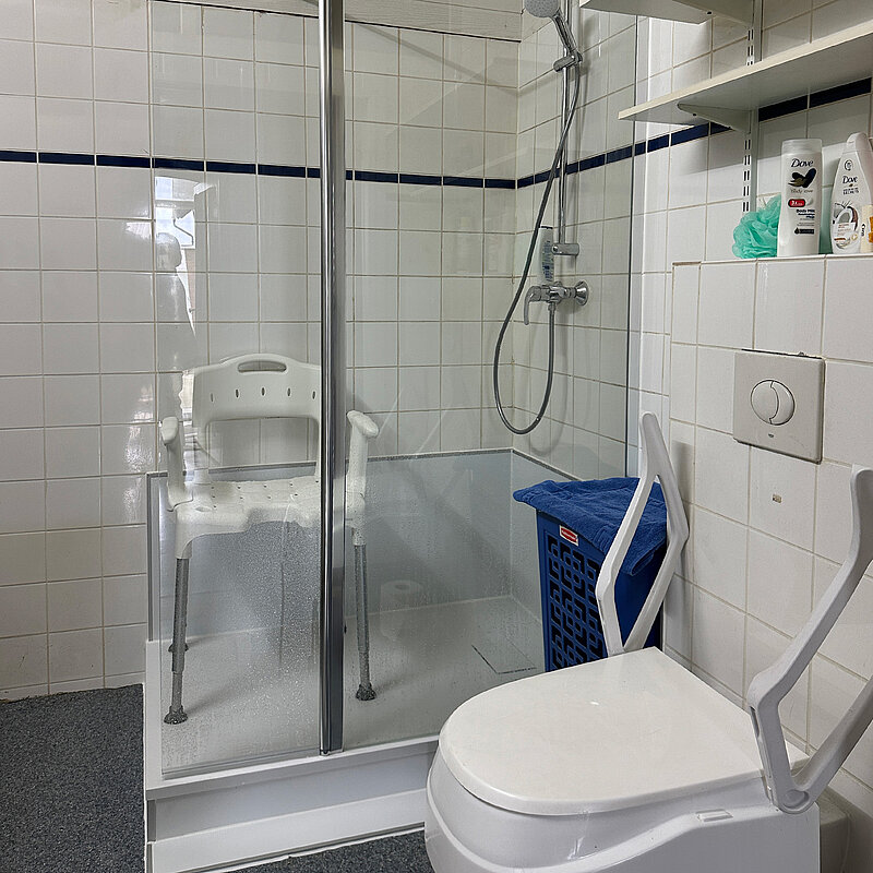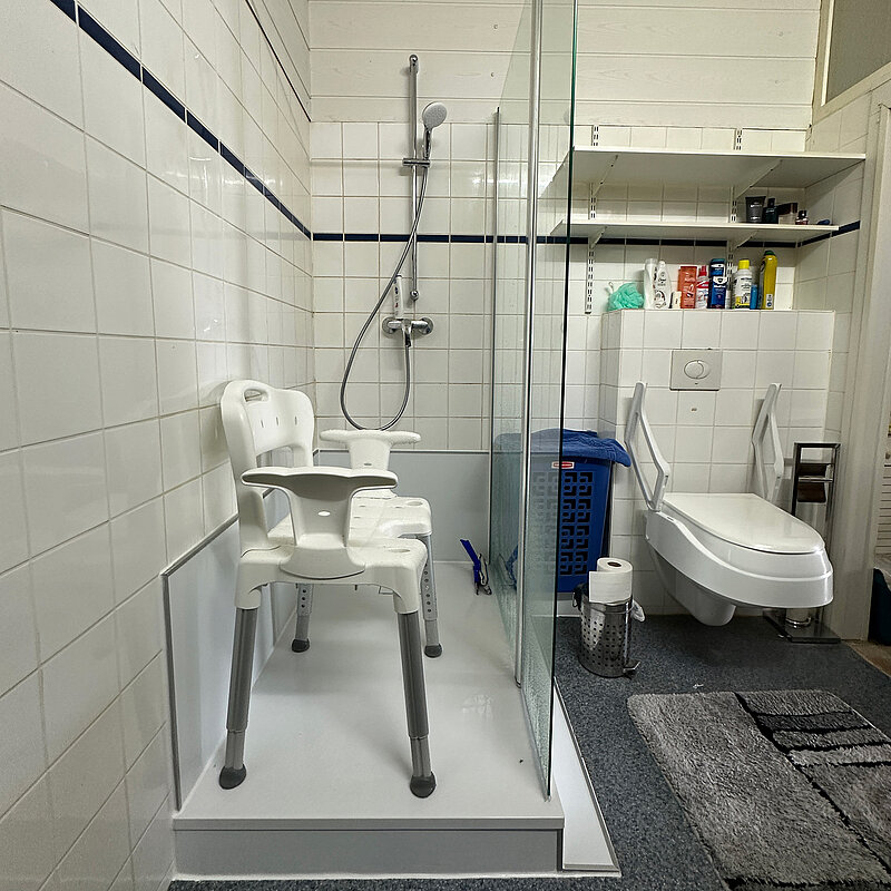 Deshalb ist die Fertigdusche in eine barrierarme Dusche umgebaut worden. Zusätzlich wurde die Duschabtrennung mit einer nach außen öffnenden Tür geändert. Das war wichtig, damit ein einfacher Einstieg gewährleistet ist und die geöffnete Tür nicht den Zugang zum Duschstuhl blockiert.