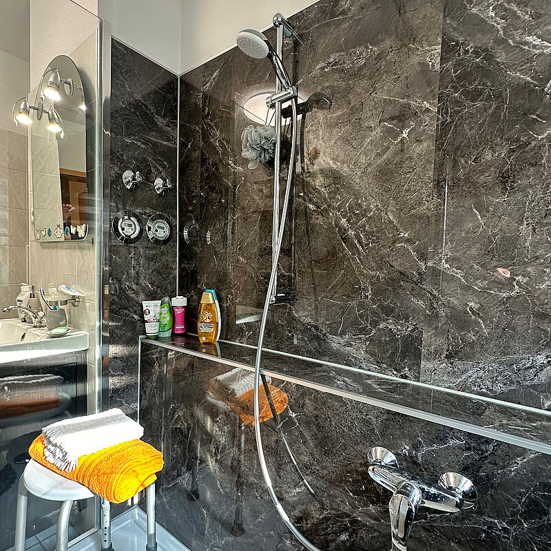 Die Bewohnerin hat sich, vor dem Hintergrund der kurzen Umbauzeit von einem Tag und des ansonsten intakten Bades, für eine Teilsanierung mit einem Umbau Wanne zu Dusche entschieden.