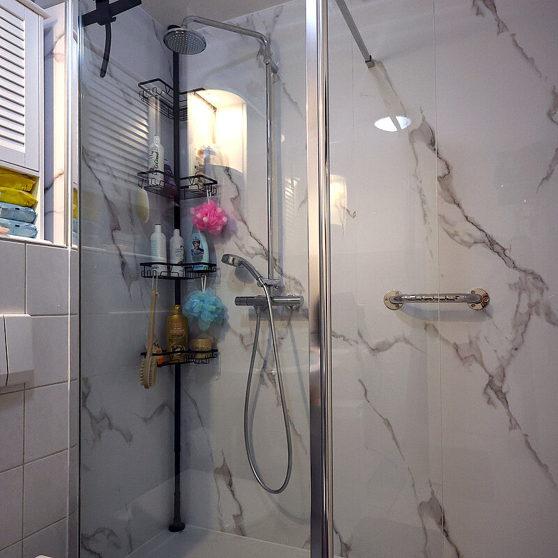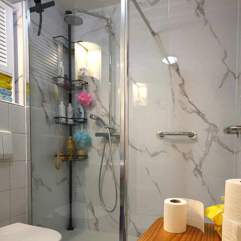 Ein kleines Bad in einer Mietwohnung. Die Mieter wohnen dort seit vielen Jahren. Aus medizinischen Gründen (Erteilung Pflegegrad), mußte die Badewanne gegen eine Dusche getauscht werden. Die Mieter wollen ihre Wohnung so lange wie möglich gemeinsam und selbstbestimmt - ohne auf die Hilfe Dritter angewiesen zu sein - nutzen und in ihrer gewohnten Umgebung verbleiben.