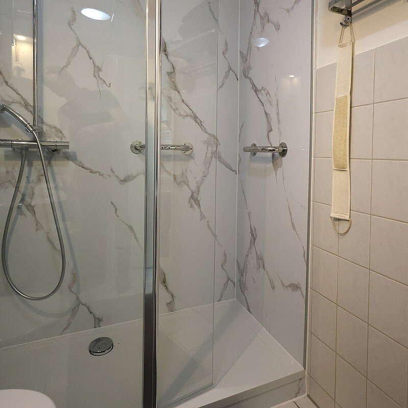 - Nach Auftragsklarstellung vereinbaren wir mit ihnen einen Umbautermin (aktuell 4 - 6 Wochen Vorlaufzeit einplanen). Ihre vorhandene Badewanne wird fachgerecht entsorgt und durch eine neue Duschtasse, in der gleichen Größe, ersetzt. Zusätzlich tauschen wir auf Wunsch ihre Duscharmaturen. Die umliegenden Fliesen bleiben erhalten und werden nicht demontiert. Sie werden mit unserem DUSCHMAX Wandverkleidungssytem einfach fugenlos überklebt.