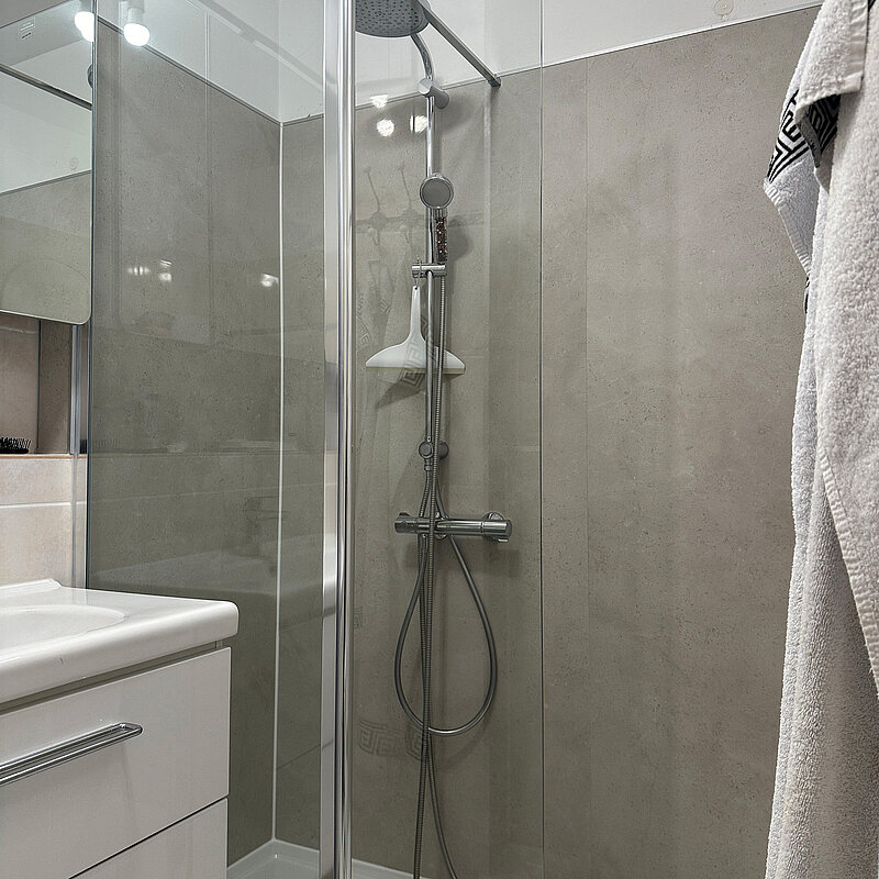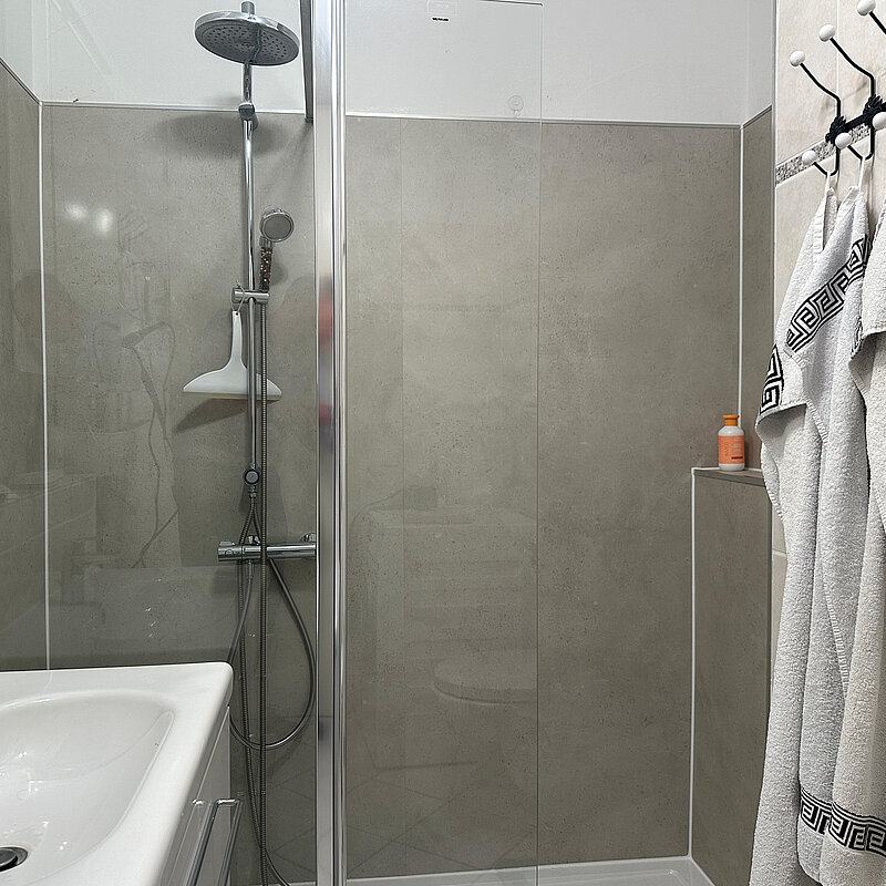 Vor dem Hintergrund der kurzen Umbauzeit (1 Tag) und des ansonsten fast neuwertigen Bades, war die Teilsanierung mit einem Umbau Wanne zu Dusche die perfekte Lösung.