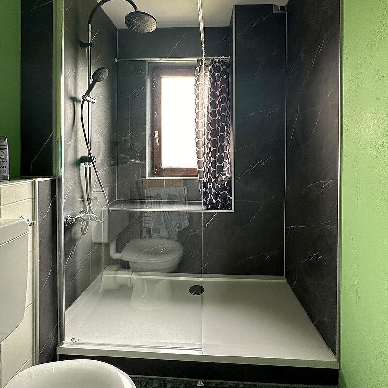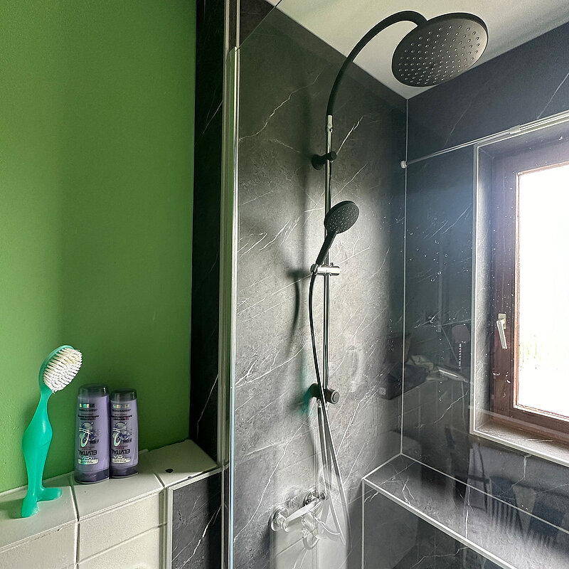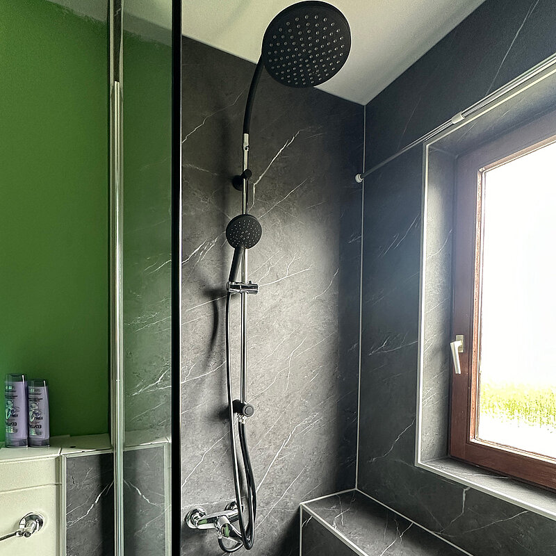 Die Eigentümer haben sich, vor dem Hintergrund der kurzen Umbauzeit (1 Tag) und der hochwertigen DUSCHMAX Wandverkleidungen, für eine Teilsanierung mit einem Umbau Wanne zu Dusche entschieden.