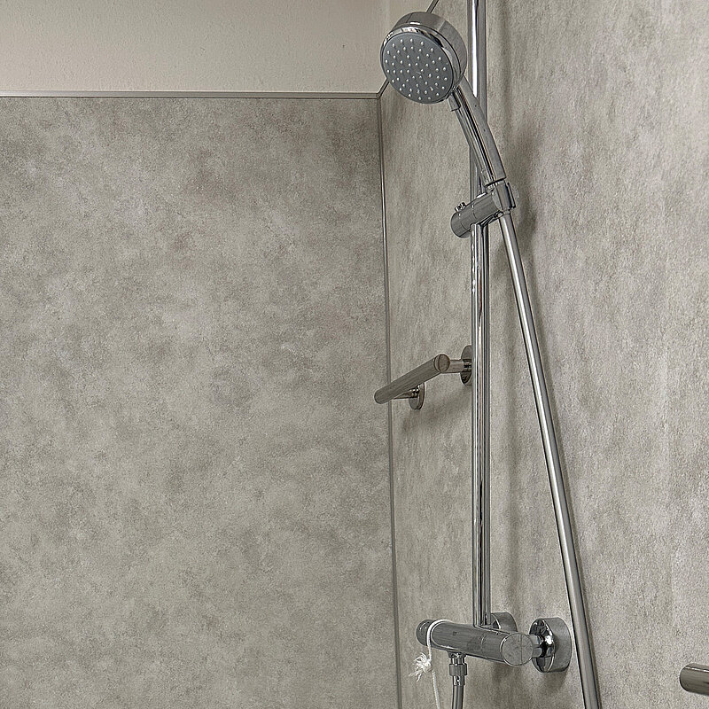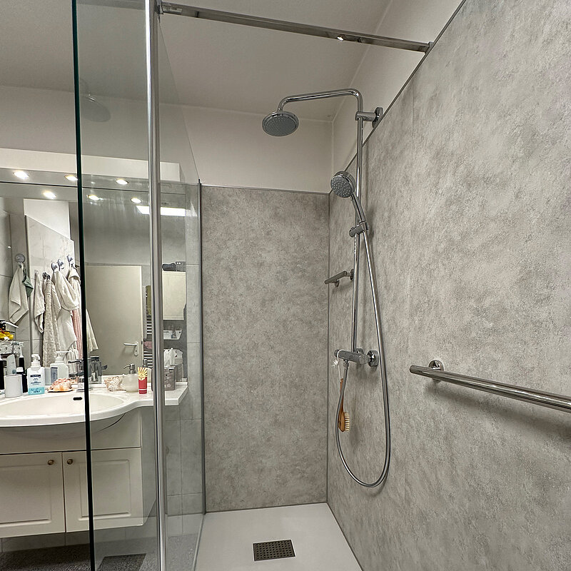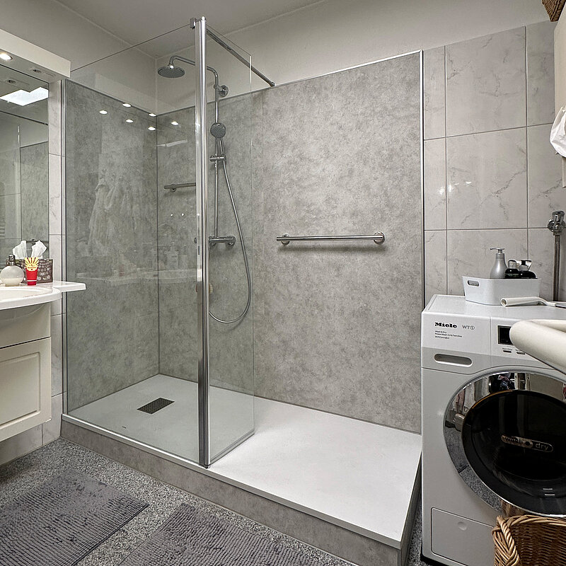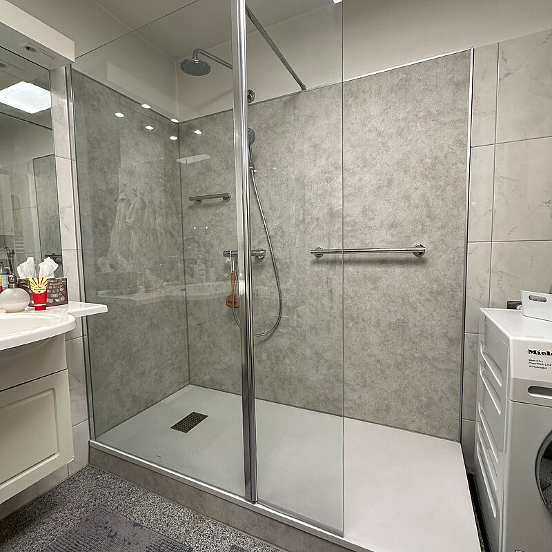 Für die Mieter ging es in diesem Fall, um eine komfortable und optisch hochwertige Lösung. Komfortabel bei der Nutzung, durch einen niedrigen Einstieg und ebenso komfortabel bei der Pflege, durch unsere fugenlosen Duschrückwände.