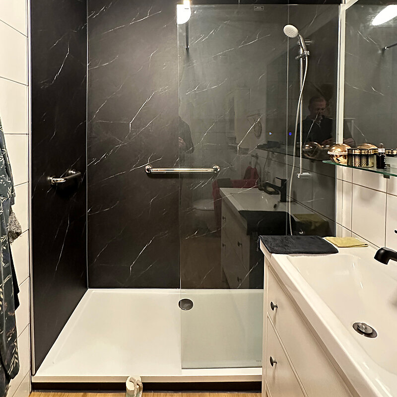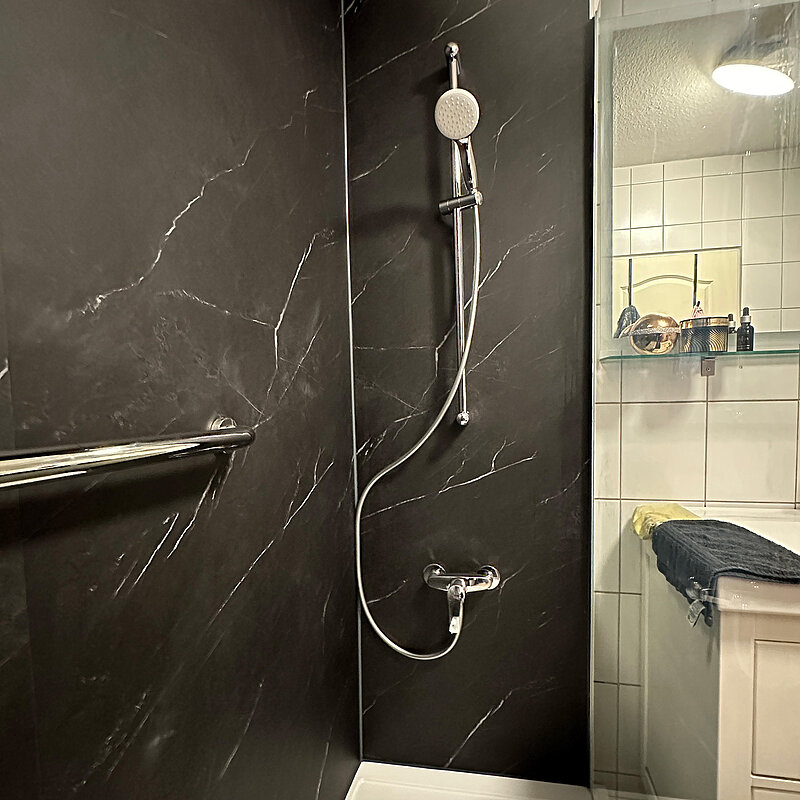- Nach Auftragsklarstellung vereinbaren wir mit ihnen einen Umbautermin (aktuell 4 - 6 Wochen Vorlaufzeit einplanen). Ihre vorhandene Badewanne wird fachgerecht entsorgt und durch eine neue Duschtasse, in der gleichen Größe, ersetzt. Zusätzlich tauschen wir auf Wunsch ihre Duscharmaturen. Die umliegenden Fliesen bleiben erhalten und werden nicht demontiert. Sie werden mit unserem DUSCHMAX Wandverkleidungssytem einfach fugenlos überklebt.